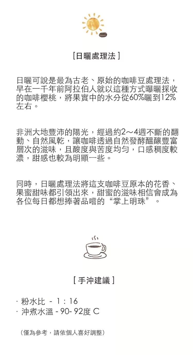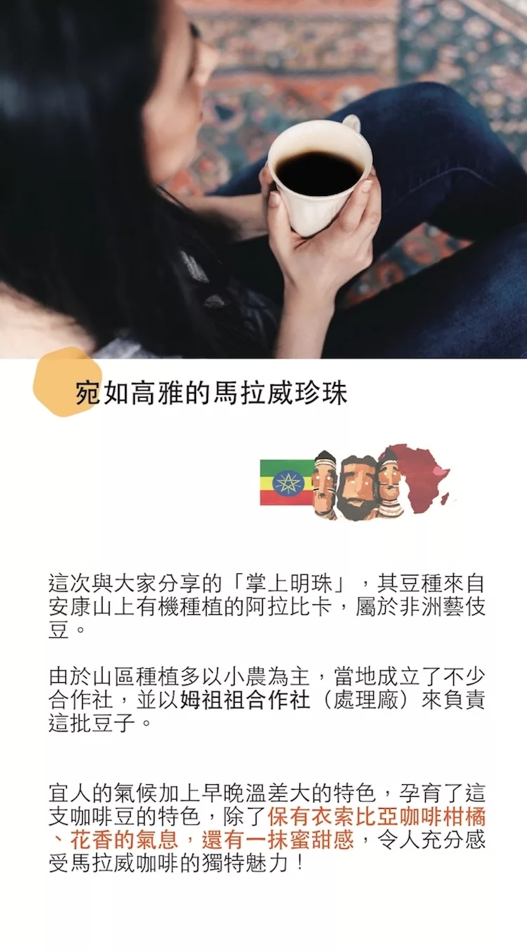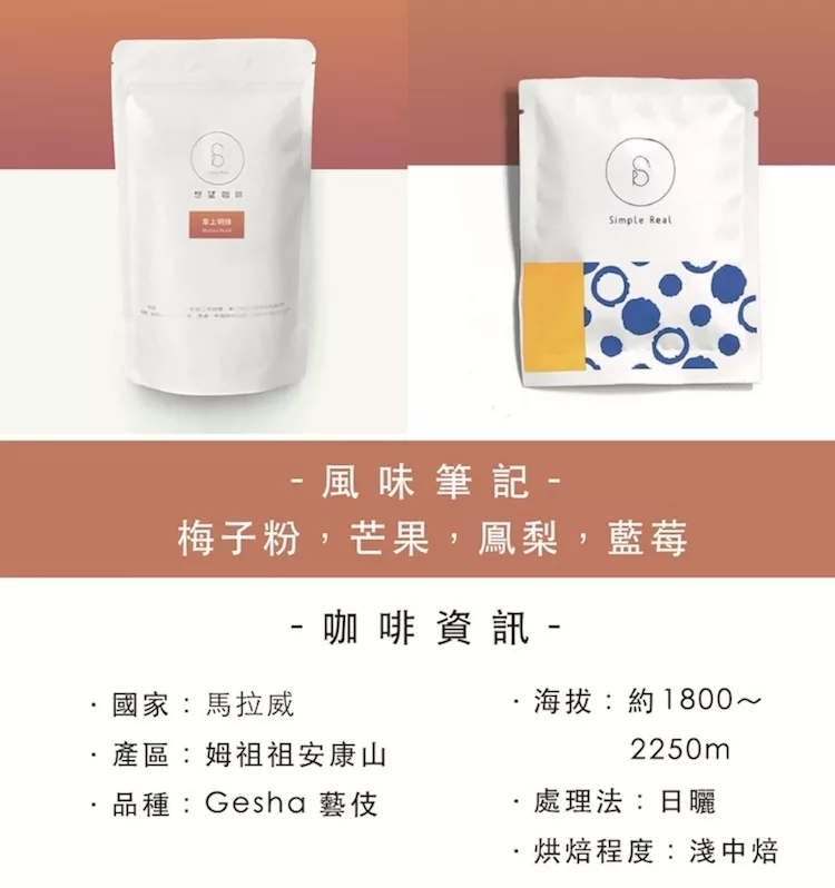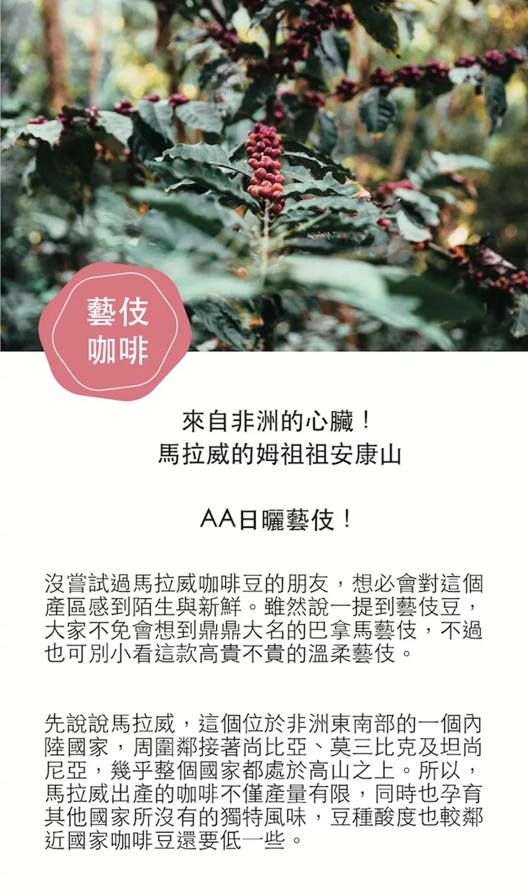 商品描述: 來自非洲馬拉威的AA日曬藝伎豆!初次見「掌上明珠」,各位一定會被它沖泡出來的微甜香氣給吸引。輕柔又清甜的香氣中,可以聞到特殊的梅粉淡淡甘甜味,輕啜一口,芒果及鳳梨的天然果香,瞬間就散佈在口腔,這樣唇齒都留香的天然果糖,更能夠襯出莓果的香味在口中顯現。風味筆記:梅子粉,芒果,鳯梨,藍莓 ・因應近期咖啡豆訂單成長,熱銷豆預先備豆子,咖啡豆新鮮烘焙,庫存皆為3天內現烘・產區:馬拉威-姆祖祖安康山・海拔:……