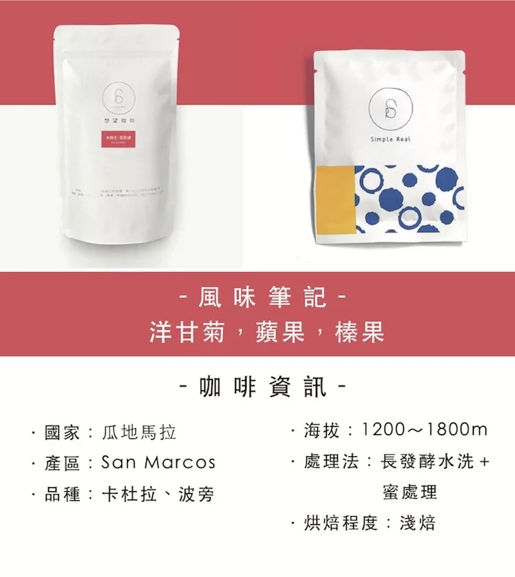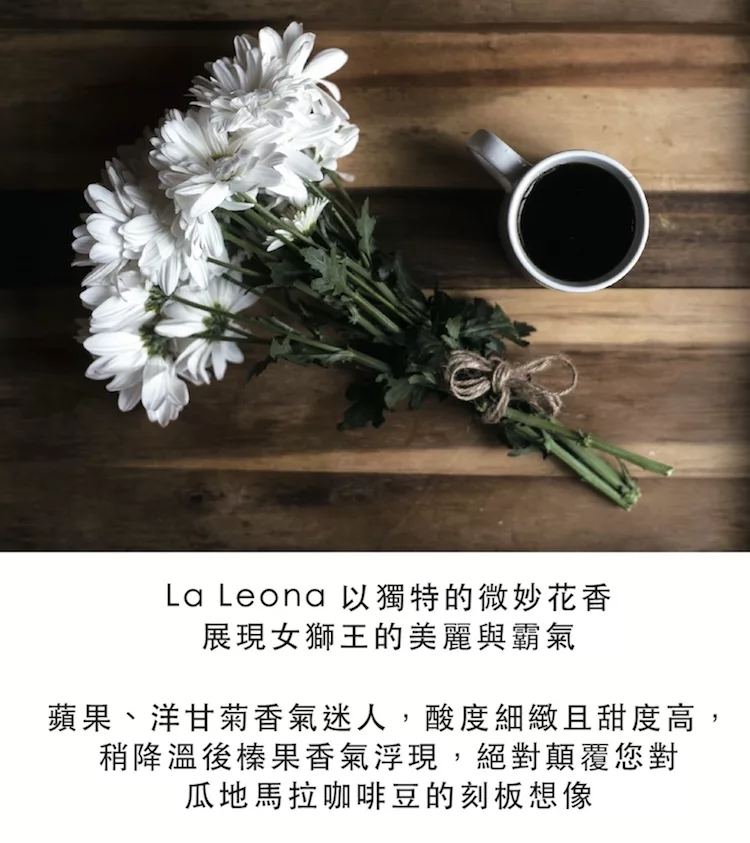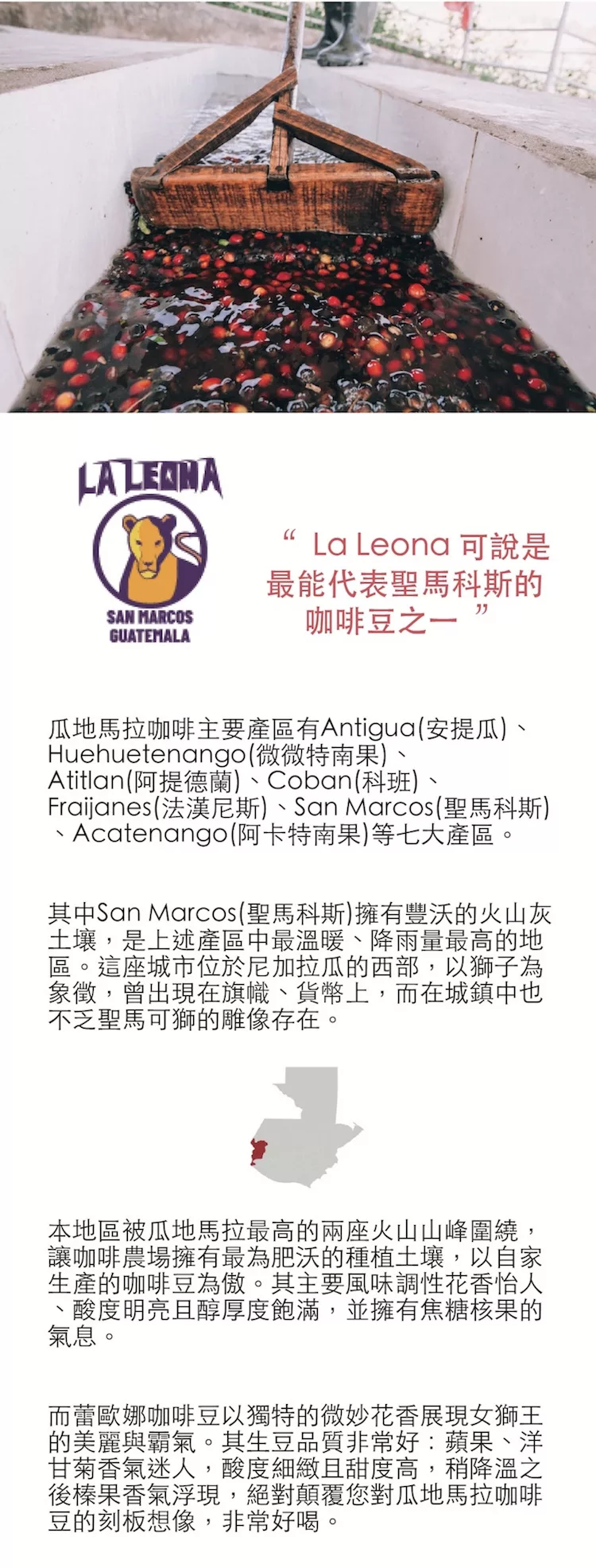 商品描述: 蕾歐娜咖啡豆將以獨特的微妙花香展現女獅王的美麗與霸氣。其生豆品質非常好,杯測後的蘋果、洋甘菊香氣迷人,酸度細緻且甜度高,稍降溫之後榛果香氣浮現,絕對顛覆您對瓜地馬拉咖啡豆的刻板想像,非常好喝。 國家:瓜地馬拉產區:SanMarcos品種:卡杜拉、波旁海拔:1200~1800m處理法:長發酵水洗+蜜處理烘焙度:淺焙風味:洋甘菊,蘋果,榛果粉水比:1:16建議水溫:90~92度 產品內容物與規格說明……